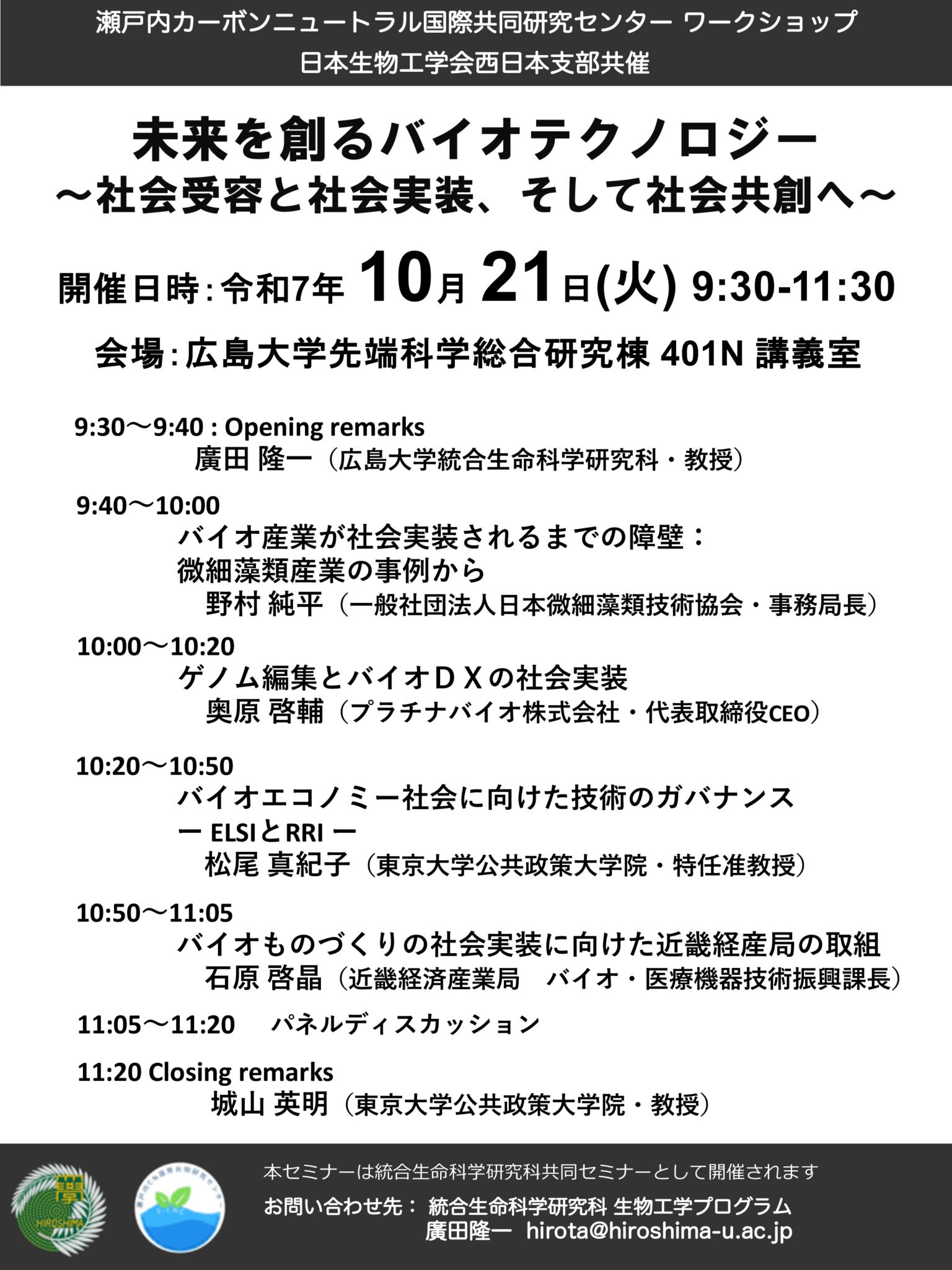 Seto Inland Sea Carbon Neutral International Joint Research Center Workshop: Biotechnology that Creates the Future: Toward Social Acceptance, Implementation, and Co‑creation